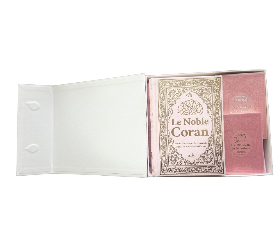 Pack cadeau rose pour femmes : Le Saint Coran (français/arabe/phonétique) + La Citadelle du Musulman + Porte coran (assortis) - REF. 23550 (35.00 €)