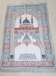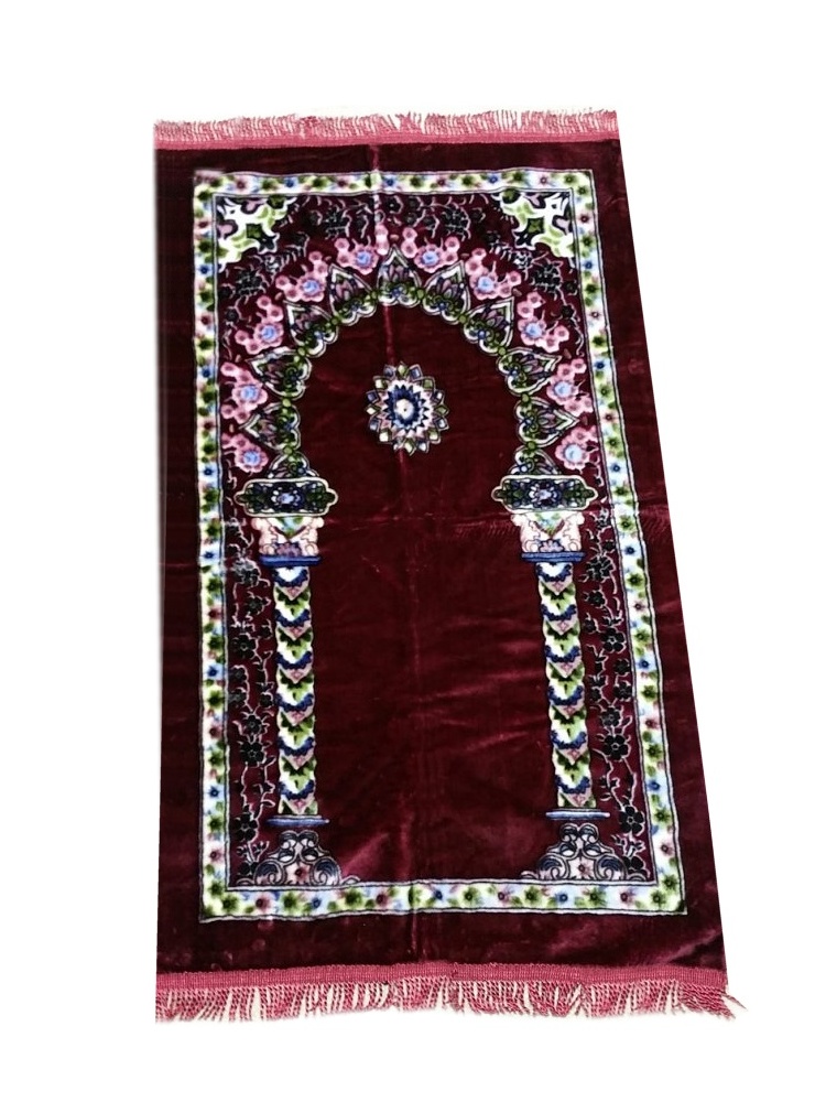 Tapis de prière musulman adulte grenat motifs rosace et 2 piliers multicolores avec direction de la qibla sous forme du mihrab.