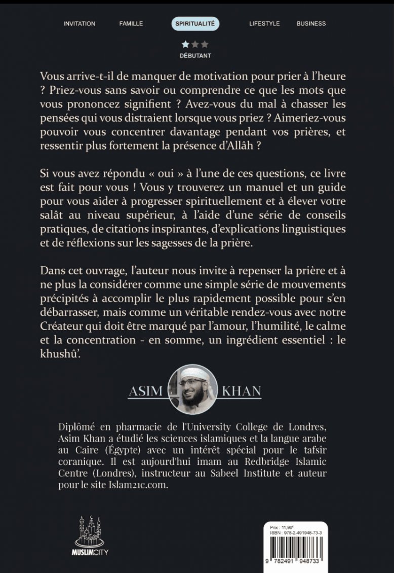 Dans cet ouvrage, l’auteur nous invite à repenser la prière et à ne plus la considérer comme une simple série de mouvements précipités à accomplir le plus rapidement possible pour s’en débarrasser, mais comme un véritable rendez-vous avec notre Créateur qui doit être marqué par l’amour, l’humilité, le calme et la concentration – en somme, un ingrédient essentiel : le khushû’.