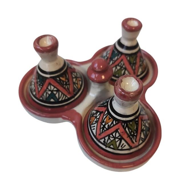 Ces tajines triples sont utilisés comme vaisselle de présentation, comme porte épices, ou simplement pour décorer votre intérieur pour une ambiance relevée en goût... A la marocaine !