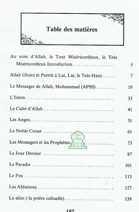 Allah Gloire et Pureté à Lui, le Très-Haut Le Messager d'Allah, Mohammad (APSS) L'Islam Le culte d'Allah Les Anges Le Noble Coran Les Messagers et les Prophètes Le Jour Dernier Le Paradis Le Feu Les ablutions La sâlat (la prière cultuelle) Livre très pratique pour les enfants Informations complémentaires.