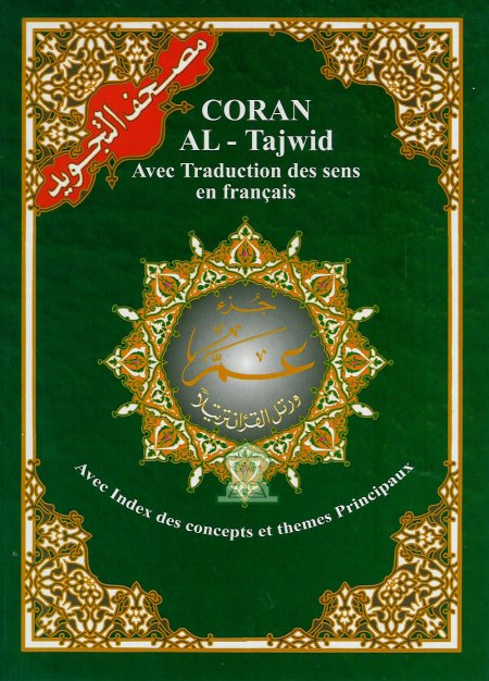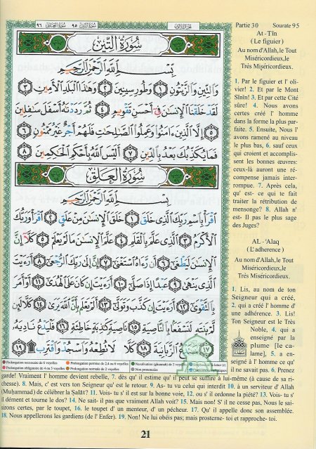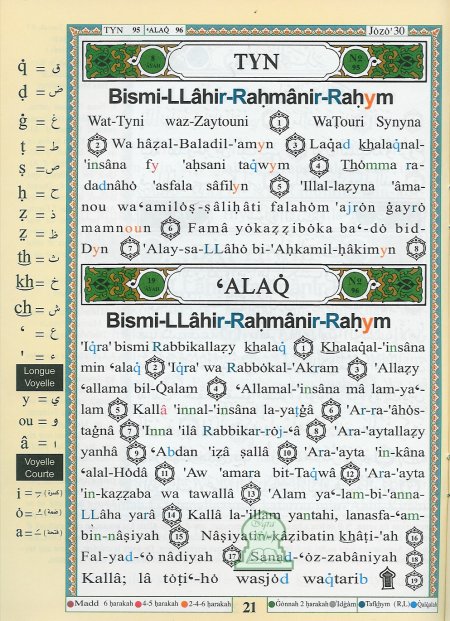 Règles de tajweed mises en valeur. Traduction française et écriture phonétique.