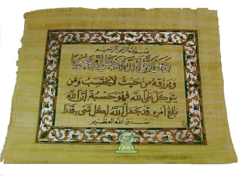 Papyrus fait main par un calligraphe montrant le verset coranique : "Et quiconque craint Allah, Il lui donne une issue par (des moyens) sur lequels il ne comptait pas. Et quiconque place sa confiance en Allah, Il lui suffit. Allah atteint ce qu'il Se propose, et Allah a assigné une mesure à chaque chose."