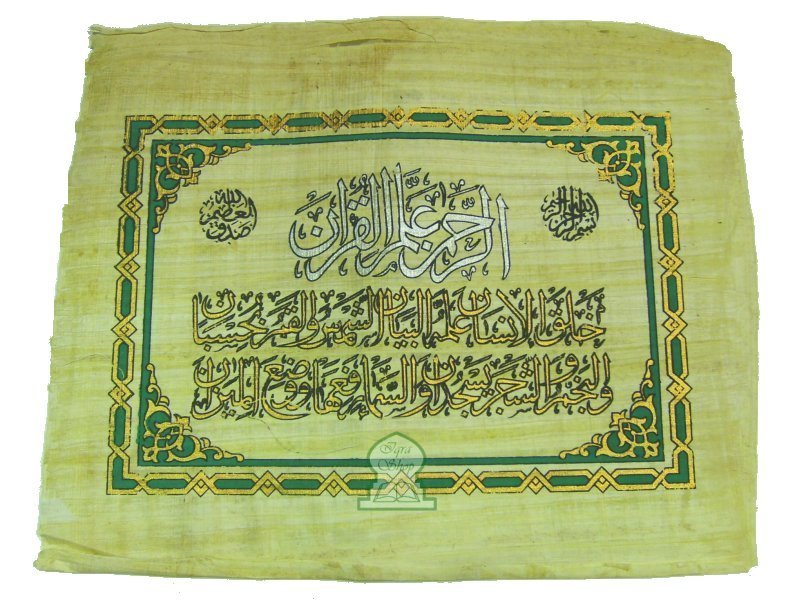 Papyrus fait main par un calligraphe montrant les premiers versets de Sourate ar-Rahman.