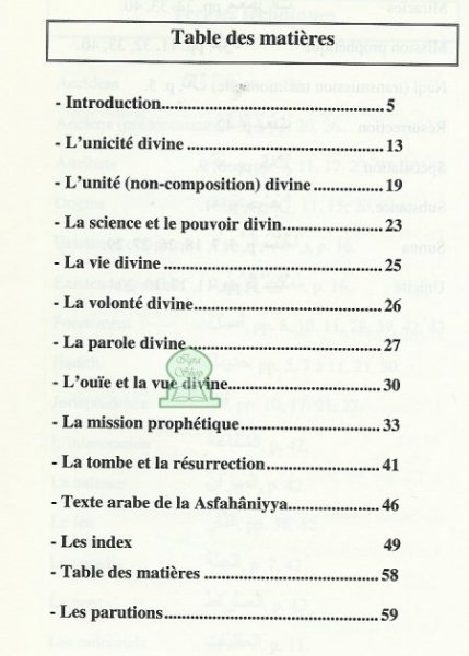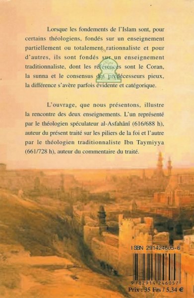 Lorsque les fondements de l'Islam sont, pour certains théologiens, fondés sur un enseignement partiellement ou totalement rationnaliste et pour d'autres, ils sont fondés sur un enseignement traditionnaliste, dont les références sont le Coran, la Sunna et le Consencus des prédécesseurs pieux, la différence s'avère parfois évidente et catégorique. L'ouvrage, que nous présentons, illustre la rencontre des deux enseignements. L'un représenté par le théologien spéculateur al-Asfahani (616/688 Hégire), auteur du présent traité sur les piliers de la foi et l'autre par le théologien traditionnaliste Ibn Taymiyya (661/728 Hégire), auteur du commentaire du traité.