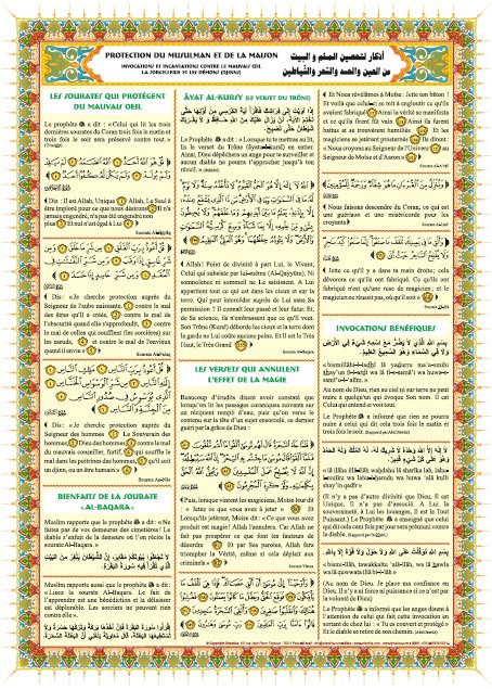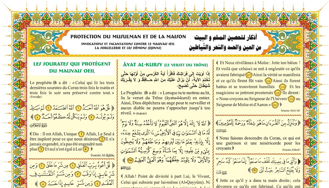 Remarque : Nous pouvons réciter des versets et des invocations que contient ce poster avec l'intention qu’ALLAH le Tout Puissant est le seul et l'unique qui peut nous protéger contre le mauvais œil, l'envie, la sorcellerie et les démons.