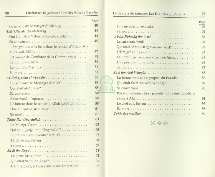 Les dix élus du Paradis est un livre pour jeunes où sont exposées les biographies des dix élus du Paradis : Abu Bakr al-Siddiq, 'Umar Ibn al-Khattâb, 'Uthmân Ibn 'Affân, Ali ibn Abû Talib, Abû 'Ubaydah ibn al-Jarrâh, al-Zubayr ibn al-'Awwâm, Talha ibn 'Ubaydallah, Sa'id Ibn Zayd, 'Abdûl-Rahmân Abi'Awi, Sa'd Ibn Abû Waqqâs.
