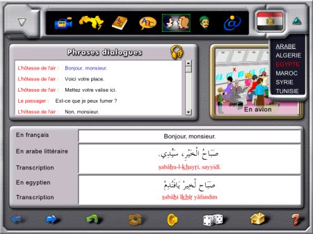 Le cédérom offre aussi la possibilité de lire et d'écouter - dans leurs particularités phonétiques - tous les mots, phrases et dialogues proposés en arabe standard et en 5 dialectes (algérien, égyptien, marocain, tunisien et syrien), avec traduction intégrale, simultanée ou à la demande, en français.