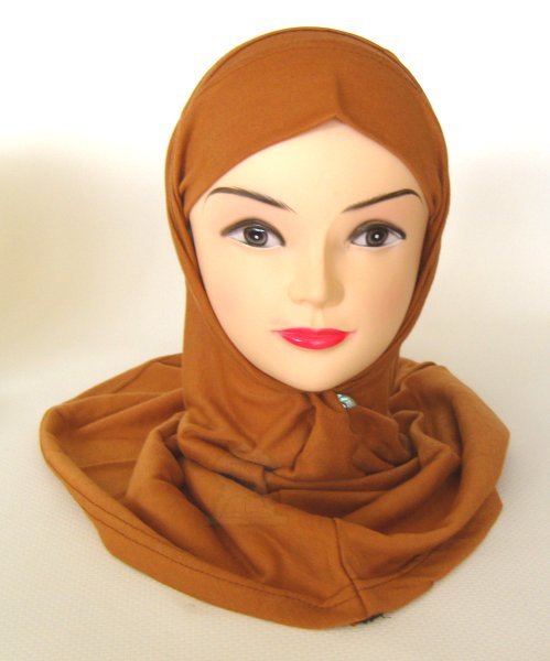 Un ensemble de hidjab deux pièces (bonnet et foulard) en coton de couleur marron.