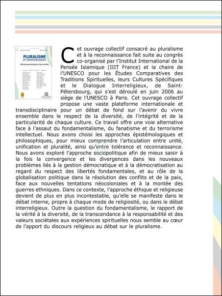 Cet ouvrage collectif consacré au pluralisme et à la reconnaissance fait suite au congrès co-organisé par l'Institut International de la Pensée Islamique et la chaire de l'UNESCO pour les études comparatives des traditions spirituelles, leurs cultures spécifiques et le dialogue inter-religieux.