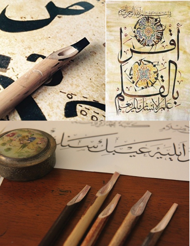 Le Calame est l'outil indispensable pour réaliser de belles calligraphies. Utilisé depuis des siècles par les scribes sur du papyrus au temps des Égyptiens de l'Antiquité, par les Grecs et jusqu'à nos jours, c'est avant tout la lettre arabe qui en coupant le bec au qalam va lui donner un riche avenir et amener une révolution stylistique.