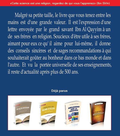 Malgré sa petite taille, le livre que vous tenez entre les mains est d'une grande valeur. Il est l'expression d'une lettre envoyée par le grand savant Ibn Al Qayyim à un de ses frères en religion. Soucieux d'être utile à ses frères, aimant pour eux ce qu'il aime pour lui-même, il donne des conseils sincères et de sages recommandations à qui souhaiterait goûter au bonheur dans ce bas monde et dans l'autre. Et vu la portée universelle de ses enseignements, il reste d'actualité après plus de 500 ans.