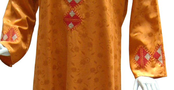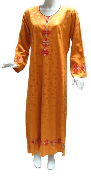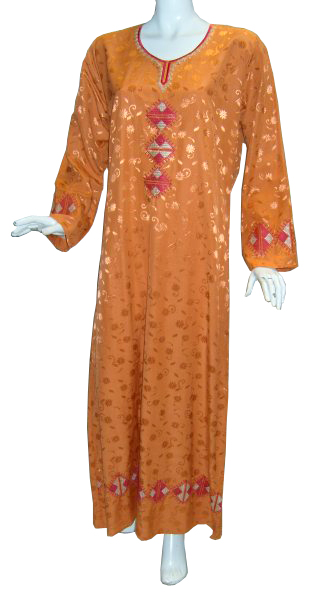 Robe Kawtar orange avec broderie rouge. Tissu avec motifs brillants.