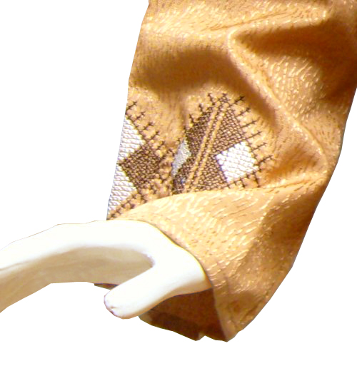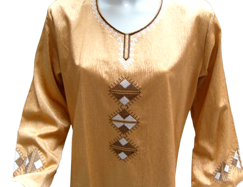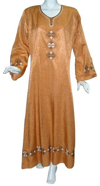 Robe Kawtar couleur rouge brique avec motifs brillants et broderies marrons.