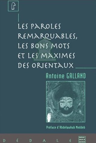 Les paroles remarquables, les bons mots et les maximes des orientaux. Traduction de leurs Ouvrages en Arabe, en Persan, en Turc, avec des remarques. L'auteur (traducteur) Antoine Galland (1646-1715) fut orientaliste, spécialiste de manuscrits anciens et de monnaies. Habitué de la Bibliothèque royale, antiquaire du roi, académicien et, pour finir, lecteur au Collège royal. La postérité a surtout retenu sa traduction des Mille et Une Nuits menée au début du XVIIIe siècle.