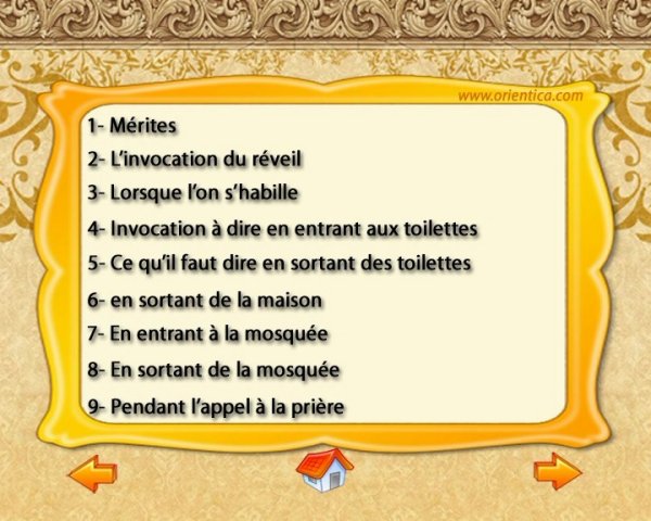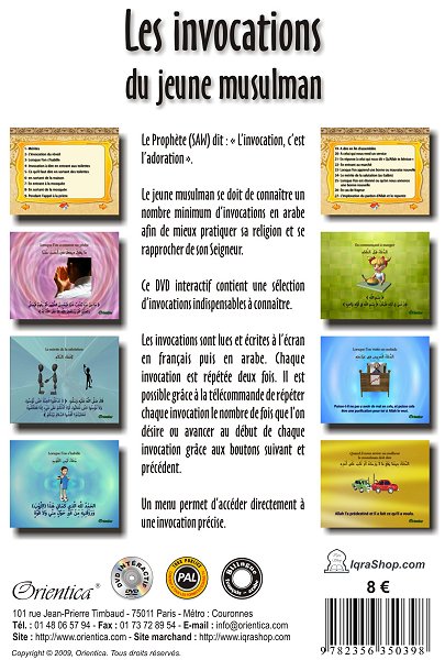 Le Prophète (SAW) dit : « L’invocation, c’est l’adoration ».Le jeune musulman se doit de connaître un nombre minimum d’invocations en arabe afin de mieux pratiquer sa religion et se rapprocher de son Seigneur.Ce DVD interactif contient une sélection d’invocations indispensables à connaître.Les invocations sont lues et écrites à l’écran en français puis en arabe. Chaque invocation est répétée deux fois. Il est possible grâce à la télécommande de répéter chaque invocation le nombre de fois que l’on désire ou avancer au début de chaque invocation grâce aux boutons suivant et précédent.Un menu permet d’accéder directement à une invocation précise.