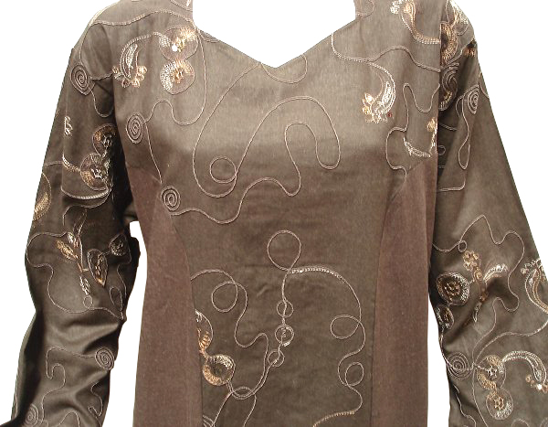 Robe Sarah marron foncé manches longues avec broderies et paillettes.