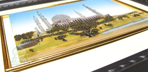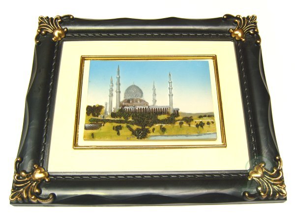 Tableau en bois avec intérieur en pierres avec reliefs représentant une mosquée.