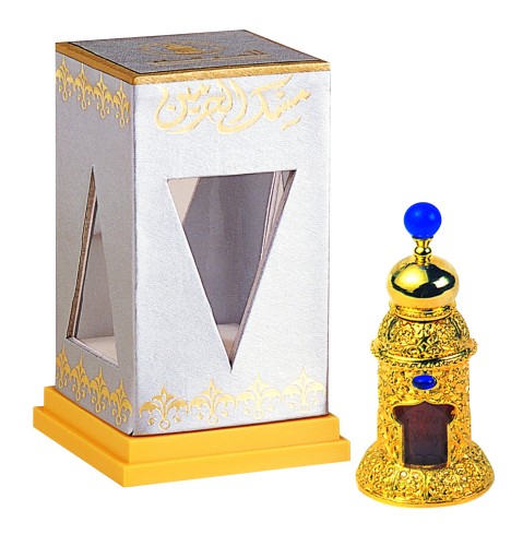 Musc concentré sans alcool "Musk Al-Haramain" dans une belle bouteille en verre recouverte de décorations métalliques dorées.