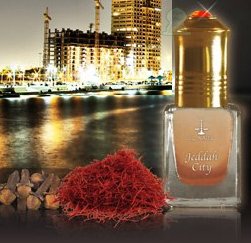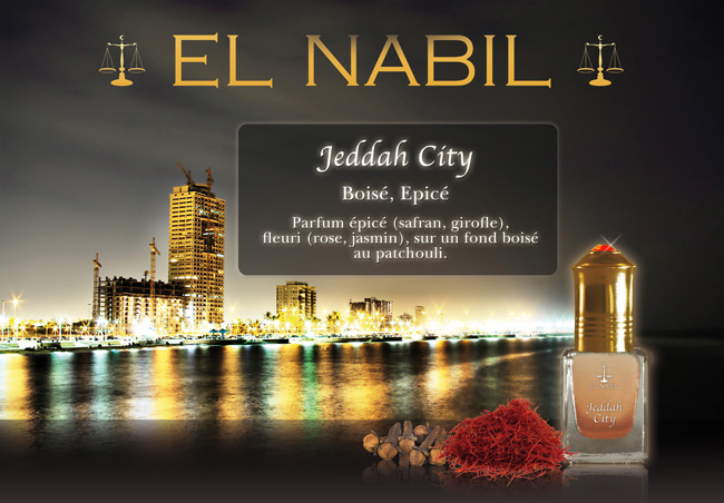 Parfum El Nabil "Jeddah City" : boisé, épicé pour hommes. Parfum épicé (safran , girofle), fleuri (rose, jasmin) sur un fond boisé (patchouli).
