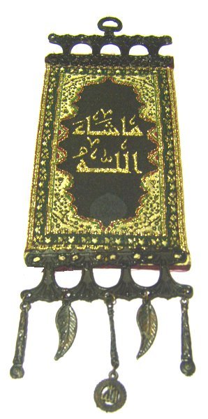 Pendentif tissé doré avec l'inscription "Masha-Allah". Les extrémités sont en métal.
