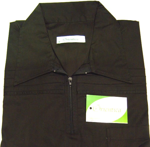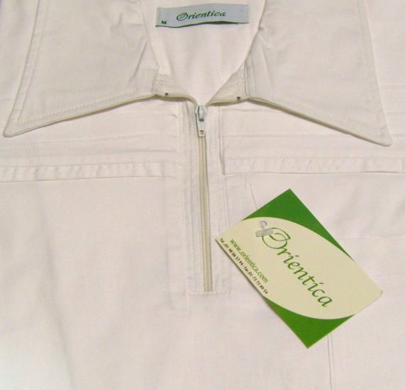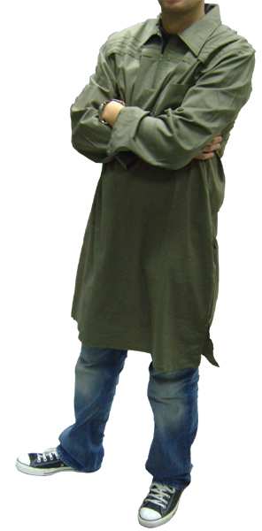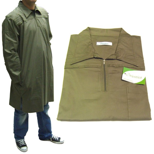 Qamis décontracté style habillé, longueur genoux, peut être mis avec tous types de pantalons. Col avec fermeture zip. Muni de trois poches, une sur la poitrine et deux latérales.