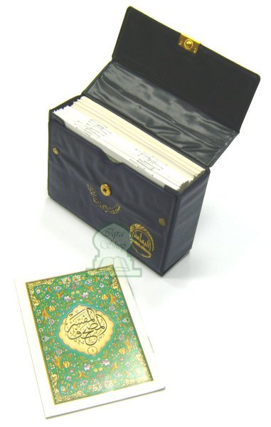 Cartable contenant le Saint Coran complet divisé en "30 juz" (chaque juz' contient deux hizb). Impression en plusieurs couleurs.