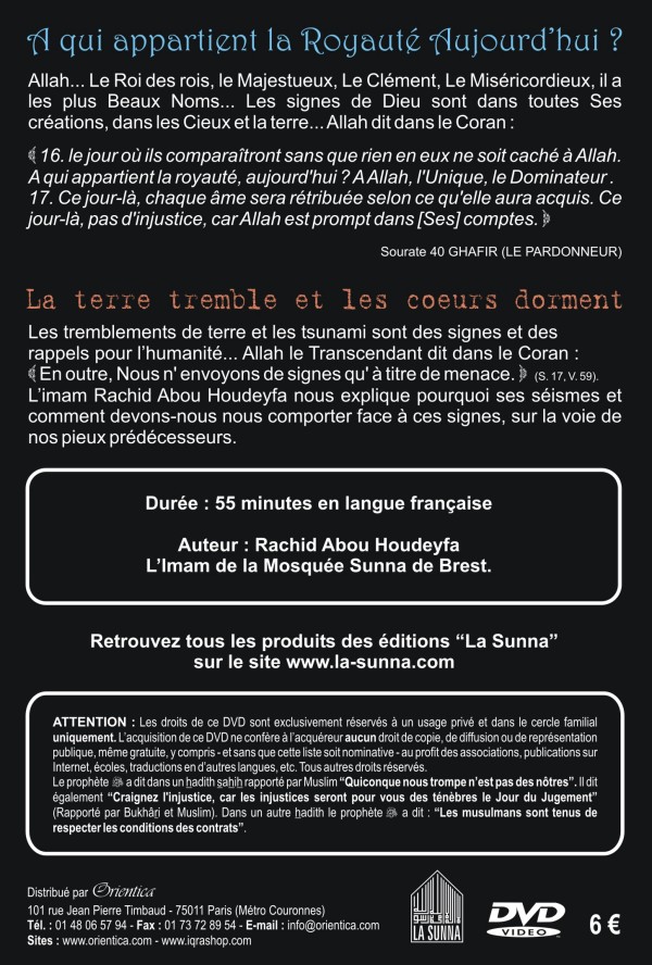 Deux sermons vidéos en langue française avec intros :1. A qui appartient la Royauté Aujourd’hui ?Allah... Le Roi des rois, le Majestueux, Le Clément, Le Miséricordieux, il a les plus Beaux Noms... Les signes de Dieu sont dans toutes Ses créations, dans les Cieux et la terre... Allah dit dans le Coran : [ 16. le jour où ils comparaîtront sans que rien en eux ne soit caché à Allah. A qui appartient la royauté, aujourd'hui ? A Allah, l'Unique, le Dominateur . 17. Ce jour-là, chaque âme sera rétribuée selon ce qu'elle aura acquis. Ce jour-là, pas d'injustice, car Allah est prompt dans [Ses] comptes. ] Sourate 40 GHAFIR (LE PARDONNEUR)