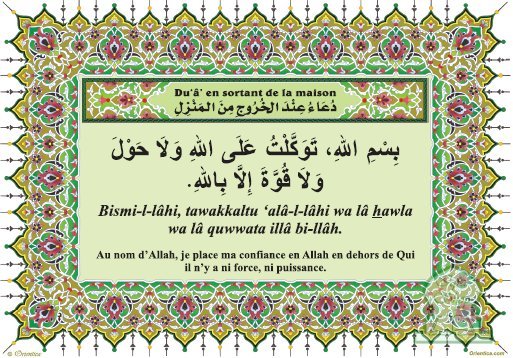 Bismi-l-lâhi, tawakkaltu ‘alâ-l-lâhi wa lâ hawla wa lâ quwwata illâ bi-llâh.