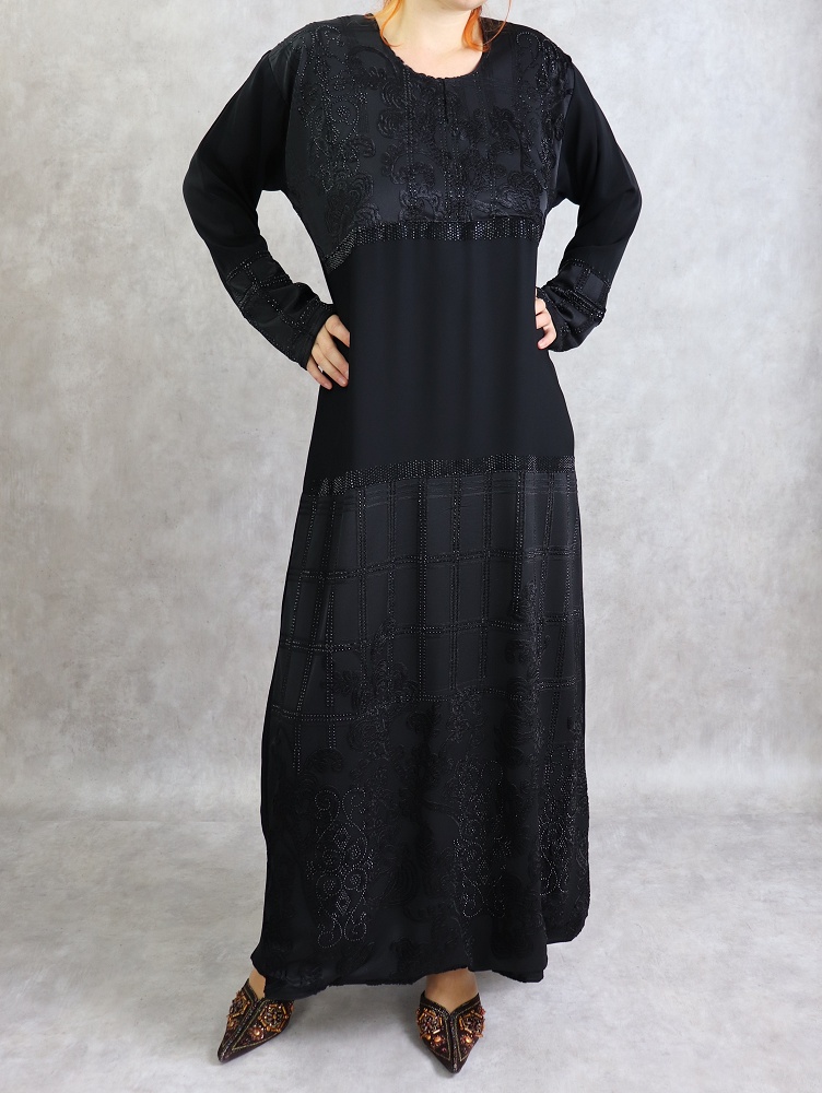 Robe longue (Abaya) noire avec strass et diamants noirs et son écharpe assortie - REF. 25278 (40.00 €)