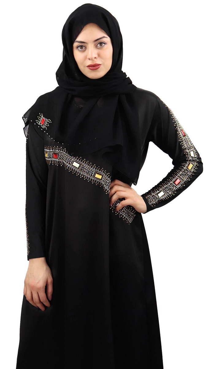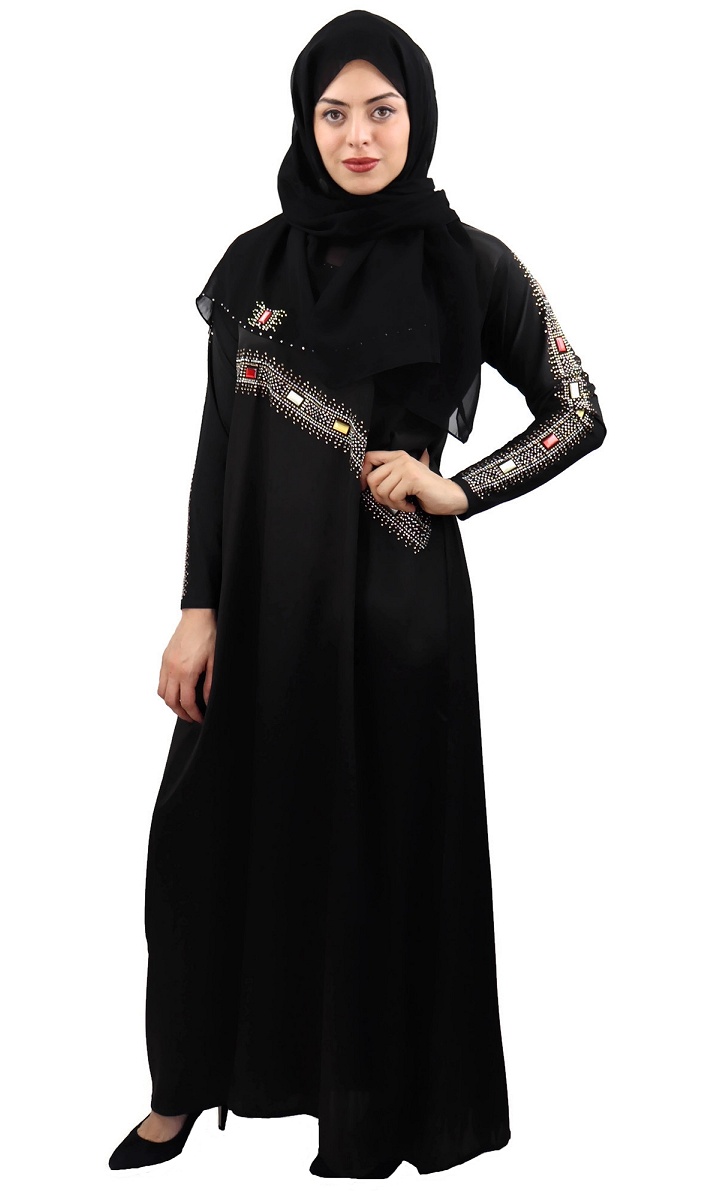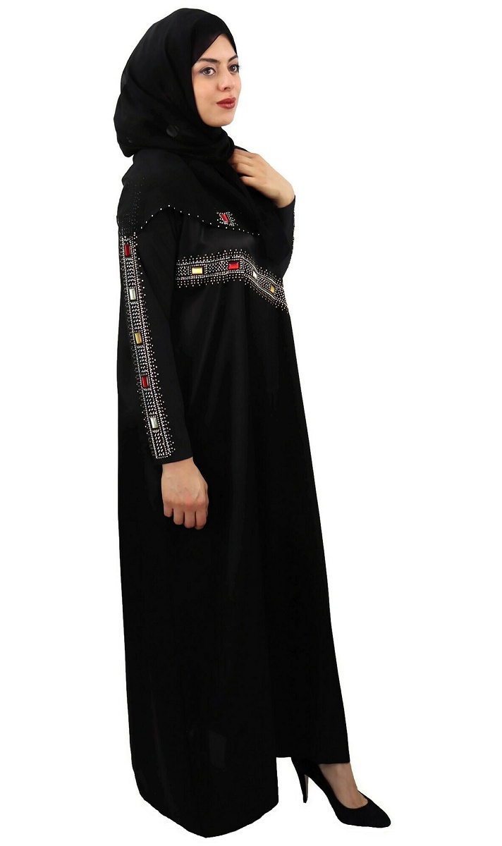 Abaya noire agrémentée de strass et rubis rouges jaunes blanc et dorés sur le devant ainsi que sur toute la longueur des manches.