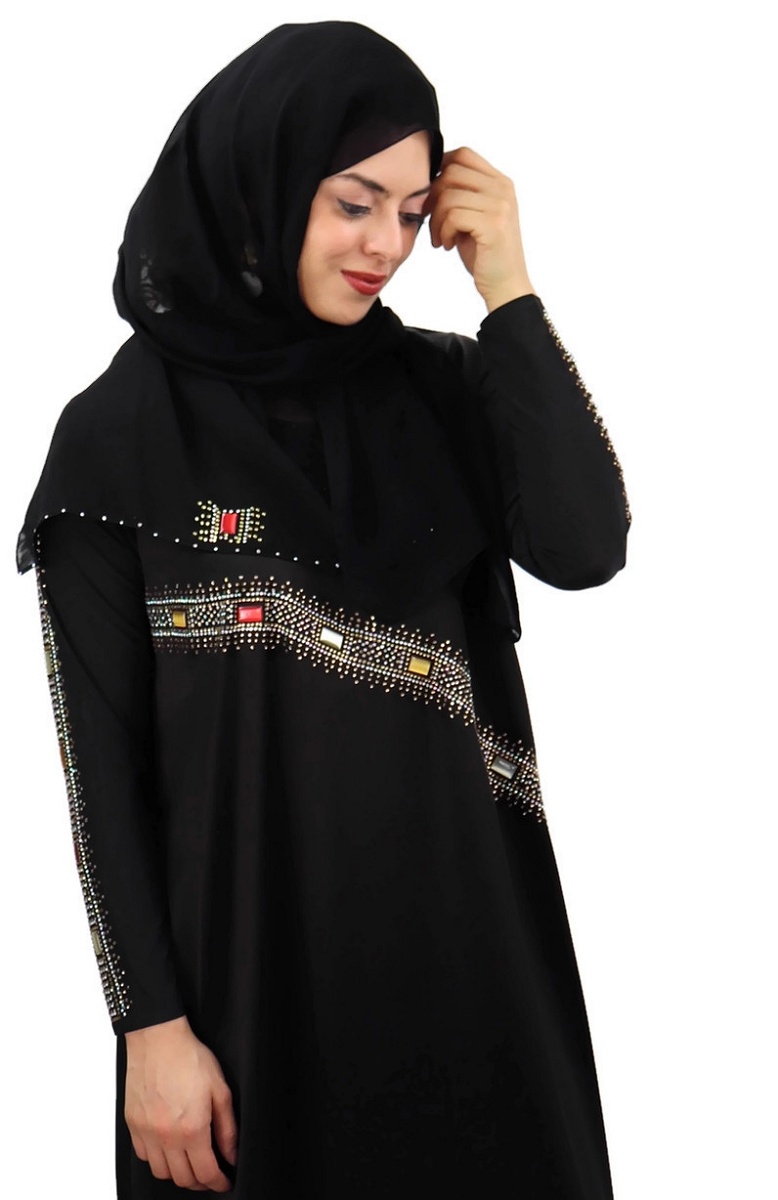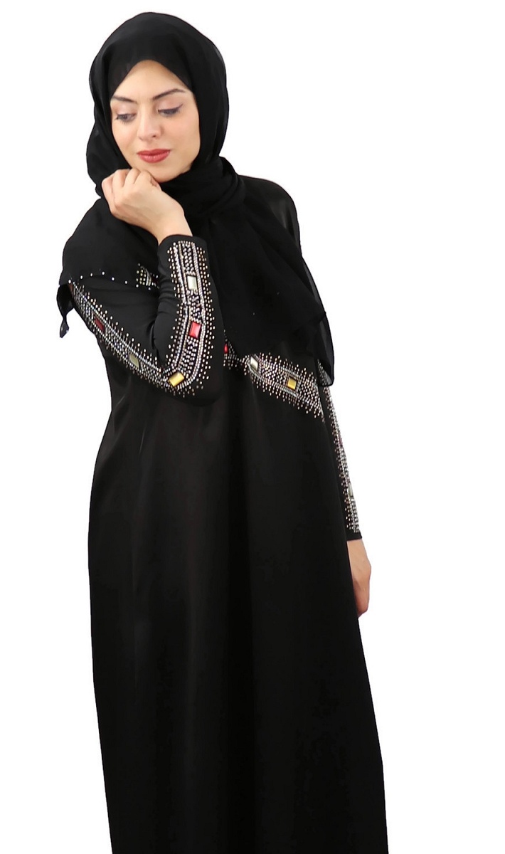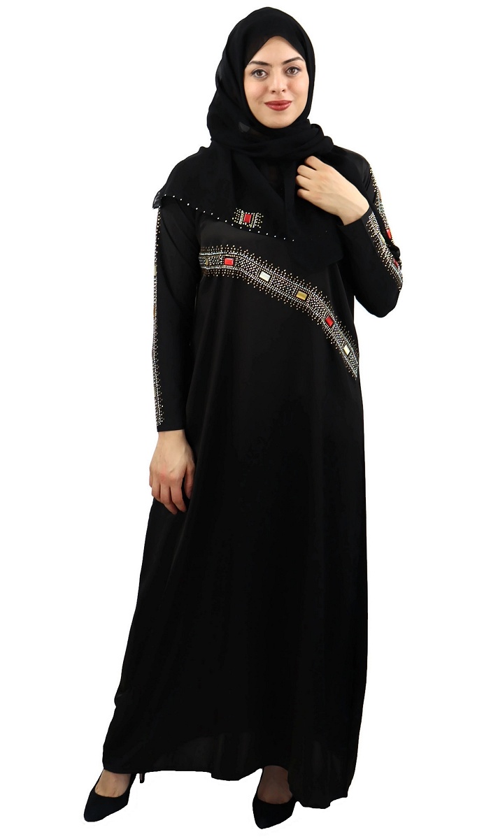 Abaya femme avec son chale assorti (voile/hijab) - Robe emirati (Dubai) avec decoration en strass et pierres rectangulaires colorees