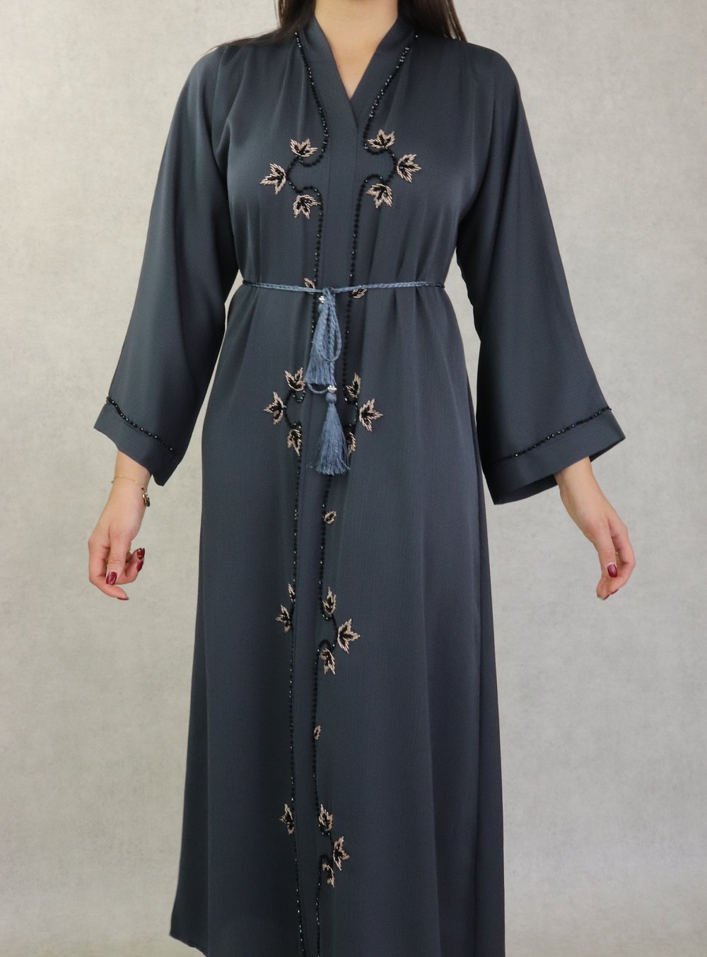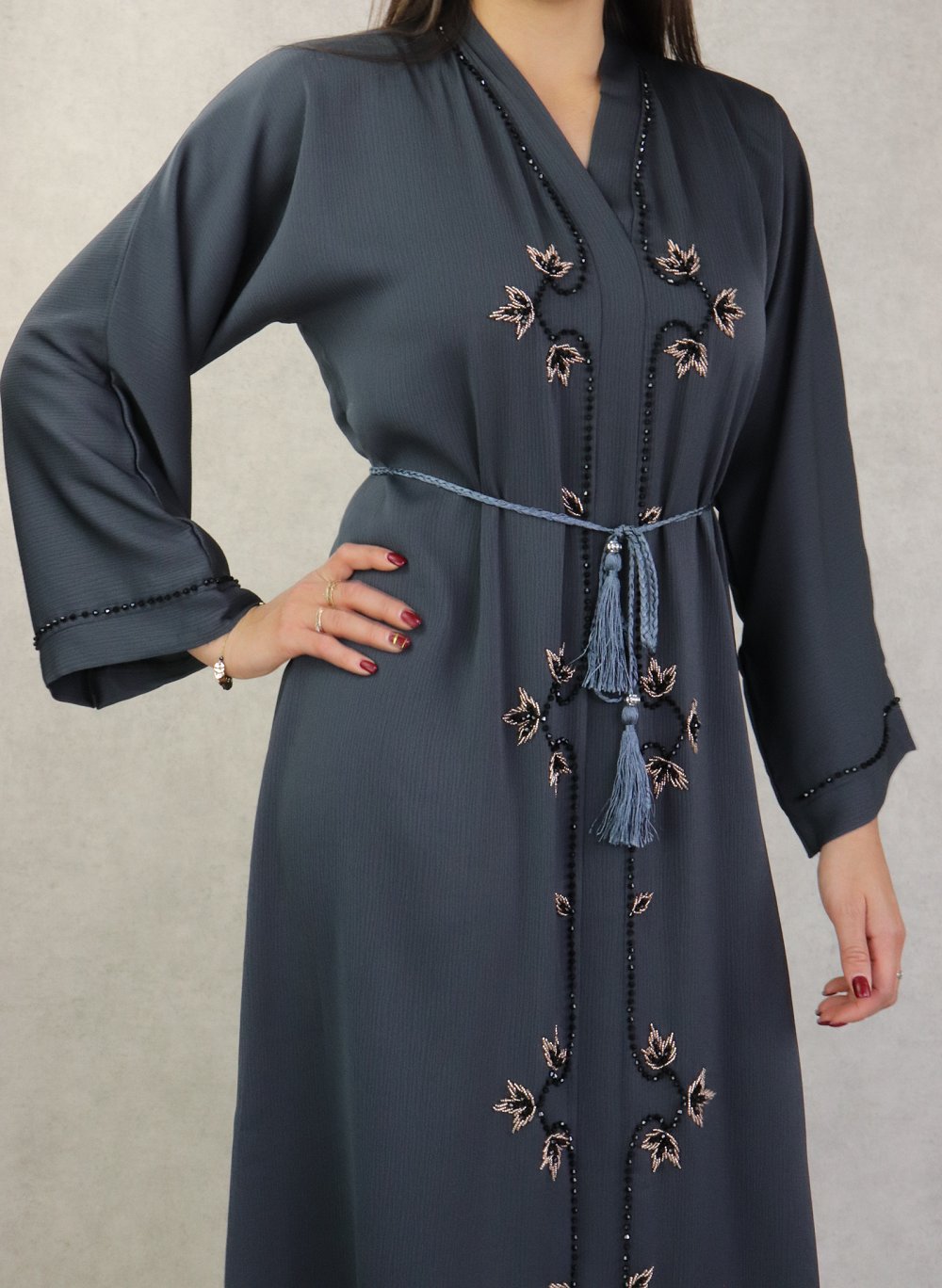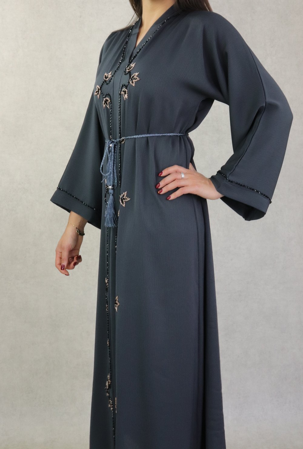 Abaya Dubai brodée à la main, de couleur grise fournie avec son châle assorti et sa ceinture.