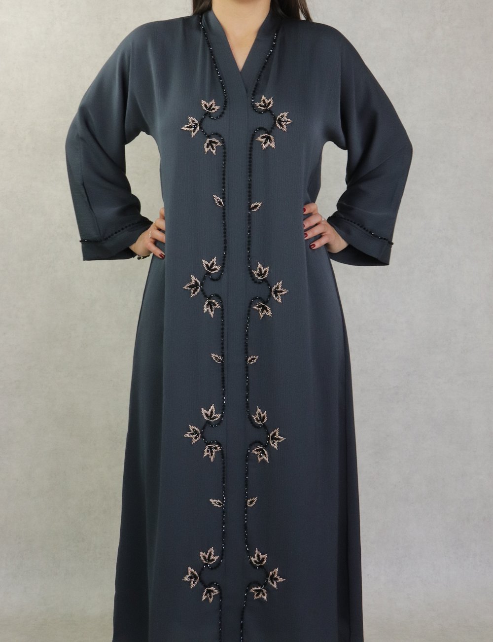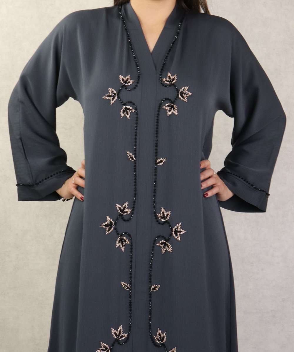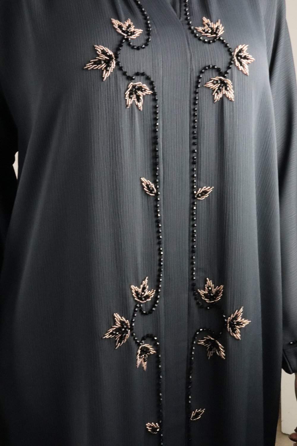 Abaya Dubai brodée à la main, de couleur grise fournie avec son châle assorti et sa ceinture.