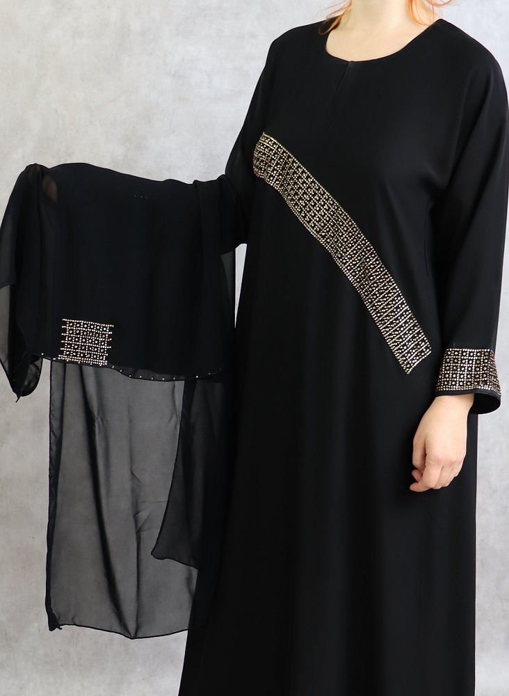 Abaya noire "Dubai" décorée de strass noires avec foulard assorti - REF. 32573 (45.00 €)