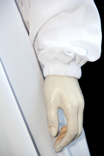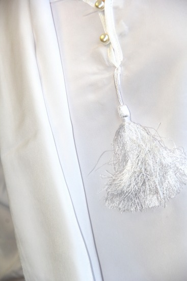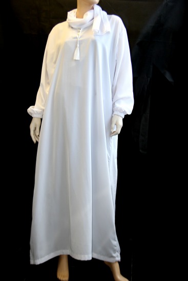Abaya simple blanche avec les manches élastiques et le col satiné blanc fermeture avec deux boutons. Fournie avec son châle (foulard).