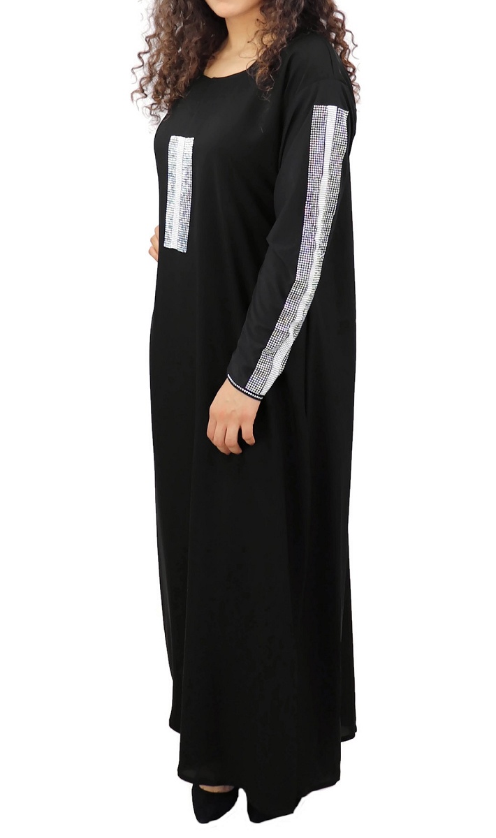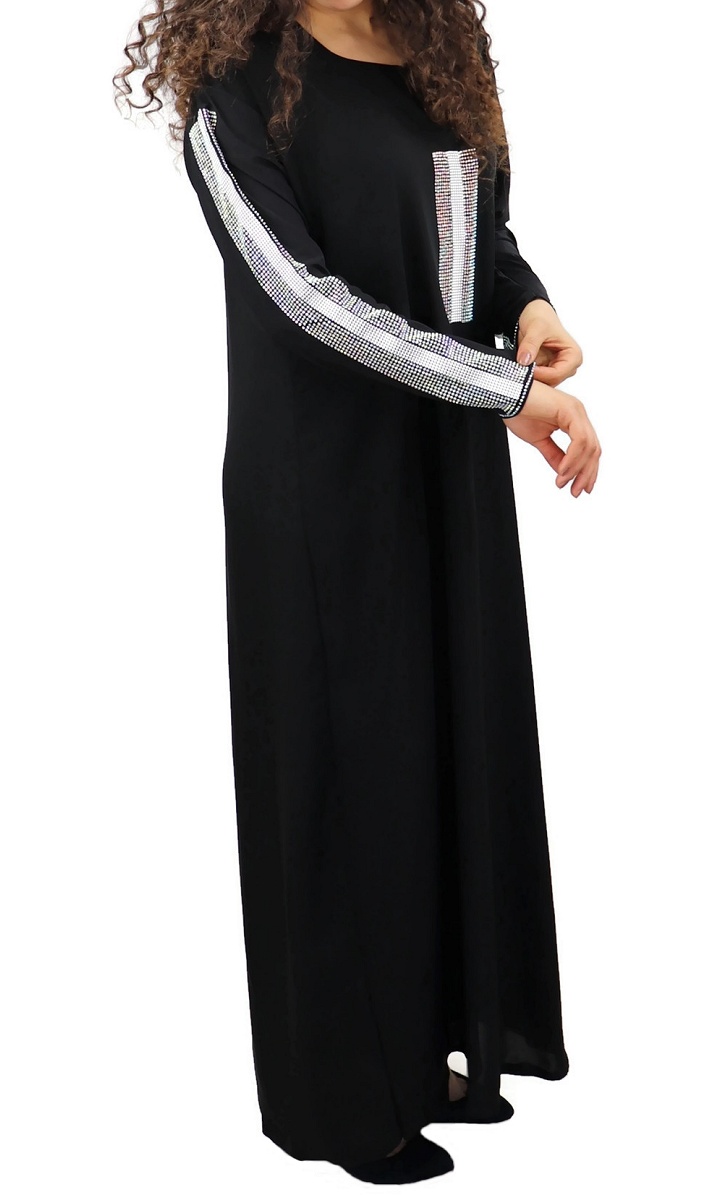 Jolie Abaya noire chic agrémentée de strass argentés sur le devant ainsi que sur toute la longueur des manches.