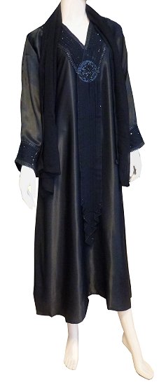 Très jolie abaya noire en tissu satiné. Motifs strassés sur le col suivi d'un pièce de tissu effet mousseline sur le devant. Le tout accompagné d'un châle assorti.