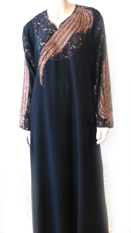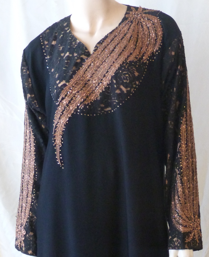 Abaya noire décorée d'une très belle broderie cuivrée ainsi que de dentelles et strass. Vous retrouverez ces décorations sur toute la longueur des manches. foulard assorti.