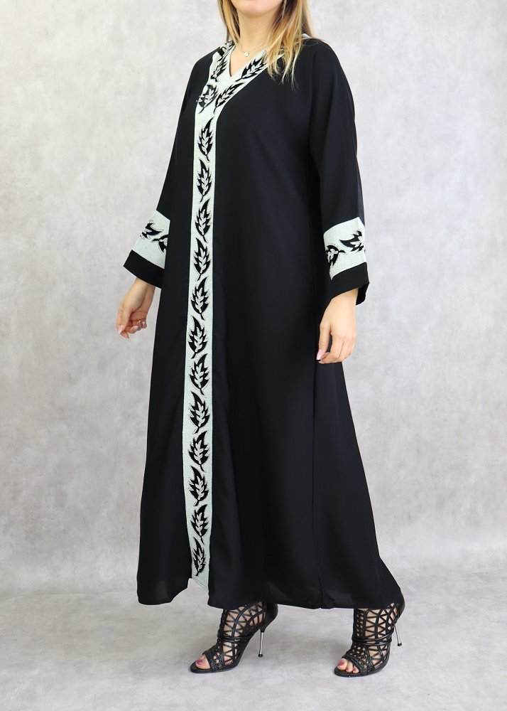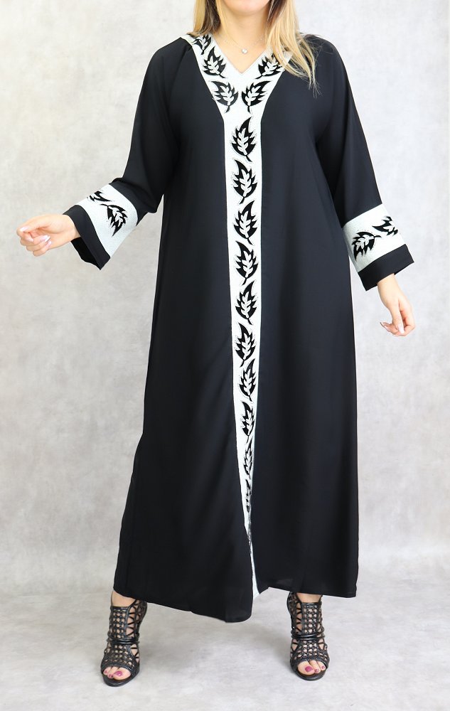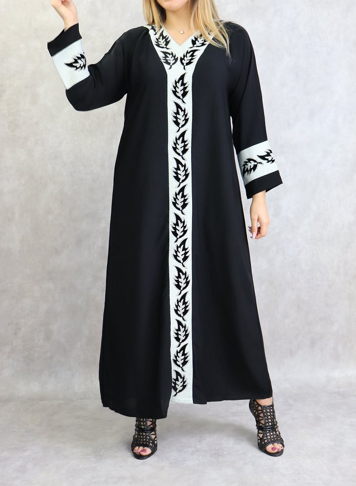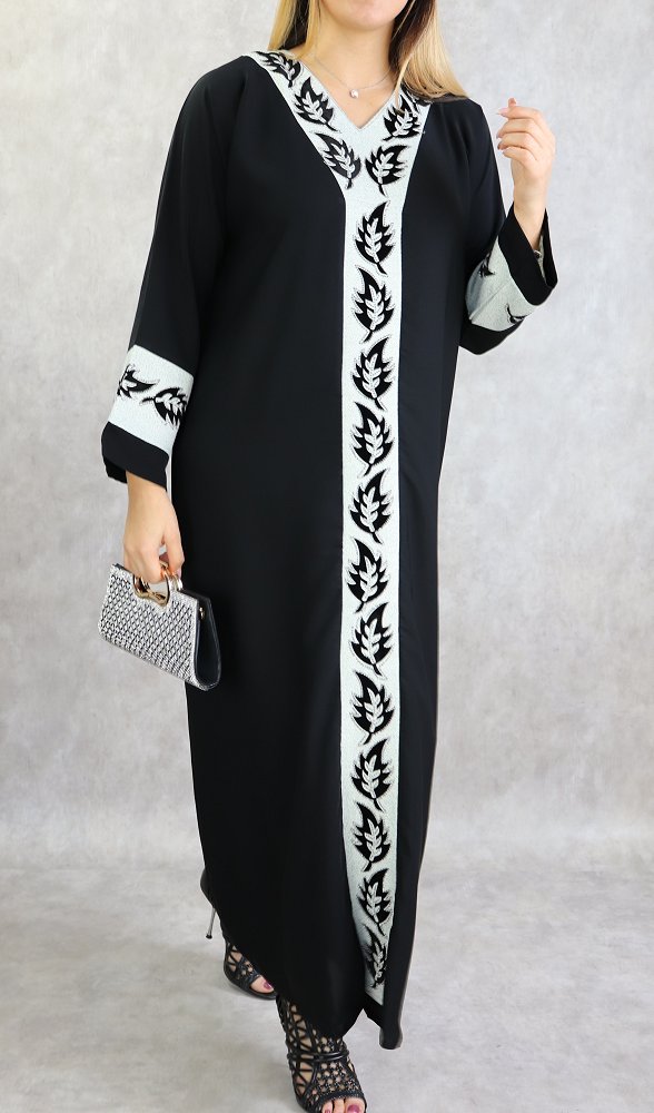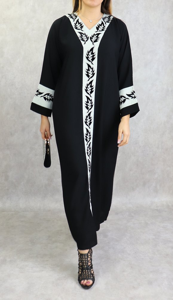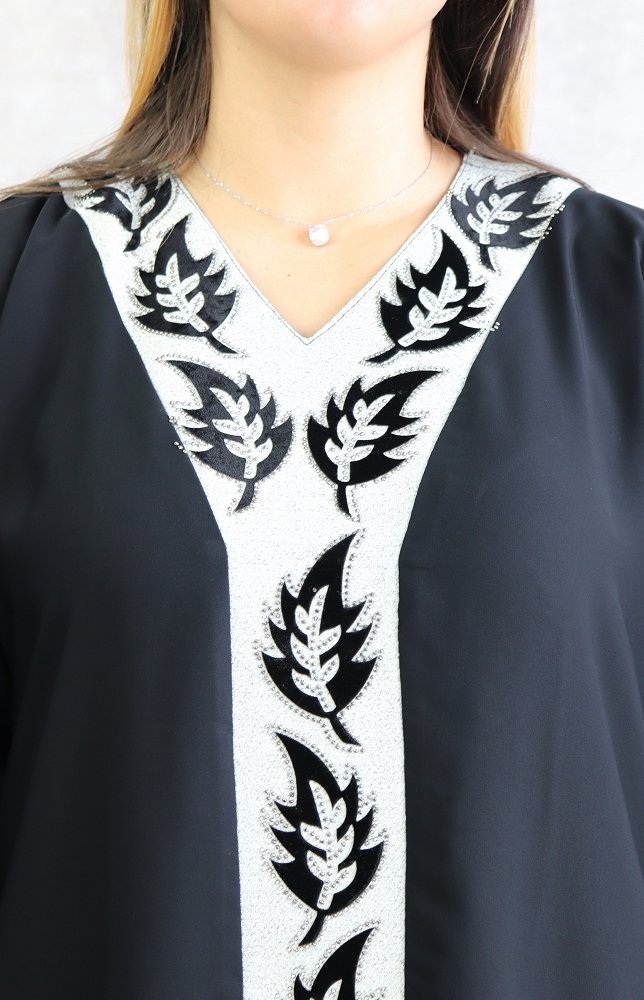 Abaya noire agrémentée de broderies blanches pailletées et de strass argentés sur toute la longueur ainsi que sur les extrémités des manches. Motifs velours noir en forme de feuilles. Echarpe noire assortie. Col en V.
