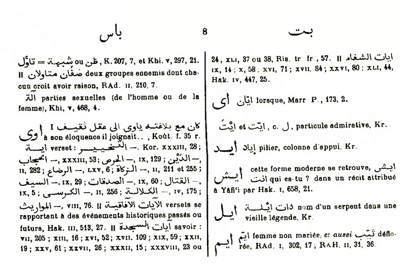 La publication du Supplément aux dictionnaires arabes, de Dozy, a marqué une date qui restera probablement la plus importante dans le développement de la lexicographie de cette langue. Le savant arabisant n´a d´ailleurs pas hésité à avouer la perfectibilité de son travail en constatant (p. XI de sa Préface, à laquelle je ne peux faire mieux que de renvoyer) l´impossibilité, pour un seul homme, d´être assez au courant des diverses branches de connaissances pour arriver à établir un dictionnaire à peu près complet. Aussi n´ai-je d´au Ire prétention que d´apporter quelques matériaux au Thesaurus qu´on ne peut songer de sitôt à rédiger.