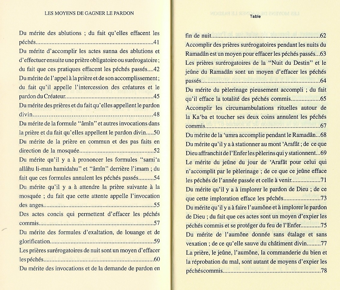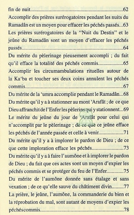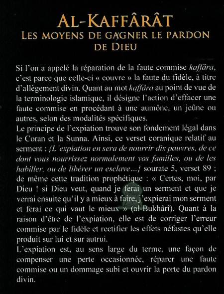 Al Kaffârât : Les moyens de gagner le pardon de Dieu. Si l'on a appelé la réparation de la faute commise kaffara, c'est parce que celle-ci " couvre " la faute du fidèle, à titre d'allègement divin. Quant au mot kaffara au point de vue de la terminologie islamique, il désigne l'action d'effacer une faute commise en procédant à une aumône, un jeûne ou autres, selon des modalités spécifiques. Le principe de l'expiation trouve son fondement légal dans le Coran et la Sunna. Ainsi, ce verset coranique relatif au serment : "L 'expiation en sera de nourrir dix pauvres, de ce dont vous nourrissez normalement vos familles, ou de les habiller, ou de libérer un esclave..." sourate 5, verset 89 ; de même cette tradition prophétique : " Certes, moi, par Dieu ! si Dieu veut, quand je ferai un serment et que je verrai ensuite qu'il y a mieux à faire, j'expierai mon serment et ferai ce qui vaut le mieux " (al-Bukhari). Quant à la raison d'être de l'expiation, elle est de corriger l'erreur commise par le fidèle et rectifier les effets néfastes qu'elle produit sur lui et sur autrui. L'expiation est, au sens large du terme, une façon de compenser une perte occasionnée, réparer une faute commise ou un dommage subi et ouvrir la porte du pardon divin.