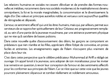 C'est dans cette perspective que le célèbre prédicateur Muhammad al-'Arîfî a rédigé cet ouvrage. Un appel lancé à la jeunesse, sans adopter de ton moralisateur, pour les inviter à se remettre en question, à revoir leur conception de l'amour et des sentiments affectifs pour les conformer aux principes de l'Islam. Car ce n'est que sur cette voie que les jeunes pourront pleinement s'épanouir et tomber réellement et noblement amoureux.