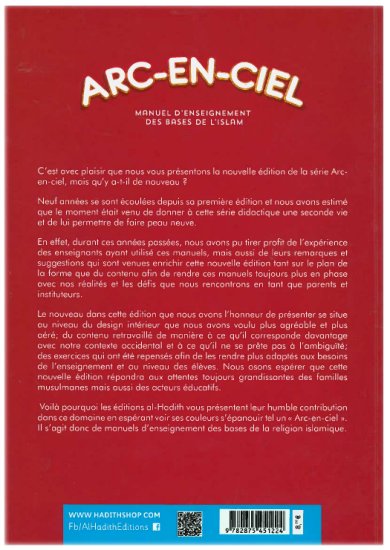 Voila pourquoi les éditions al-hadith vous présentent leur humble contribution dans ce domaine dont les fruits mûriront, nous l'espérons, tel un "Arc-en-Ciel". Il s'agit de manuels d'enseignement pédagogique des bases de la religion islamique. Les différents niveaux sont adaptés au niveau scolaire de l'enfant...