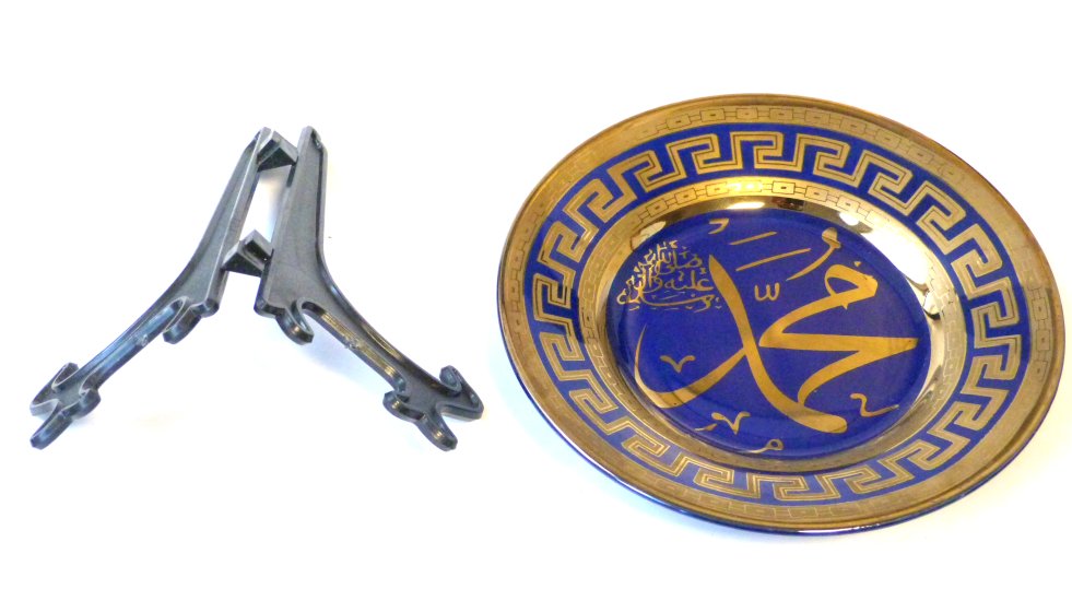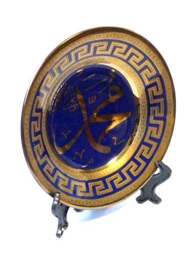 Assiette decorative bleue en porcelaine avec la calligraphie "Mohammed (SAW)" avec jolis motifs dores