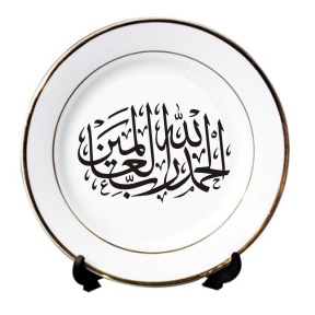 Assiette en porcelaine avec calligraphie artistique de l'invocation "al-hamdu lilâh rabbi-l-'alâmîn" (Louange à Allah Seigneur des Univers) qui est également le deuxième verset de sourate Al-Fatiha. Calligraphie réalisée par un calligraphe professionnel. Cette assiette se mariera bien avec tous types de mobilier.