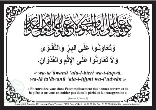 Autocollant avec le verset coranique "Et entraidez-vous dans l'accomplissement des bonnes oeuvres et de la piété et ne vous entraidez pas dans le péché et la transgression." Sourate 5 Al-Maida- Le Festin - Verset 2