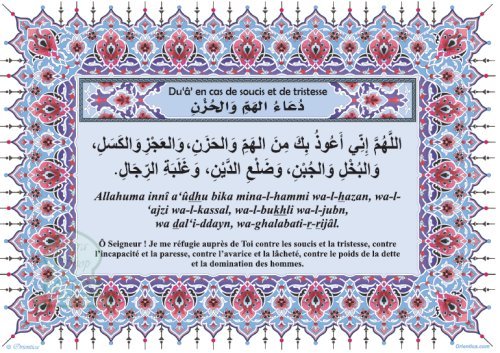 Ô Seigneur ! Je me réfugie auprès de Toi contre les soucis et la tristesse, contre l’incapacité et la paresse, contre l’avarice et la lâcheté, contre le poids de la dette