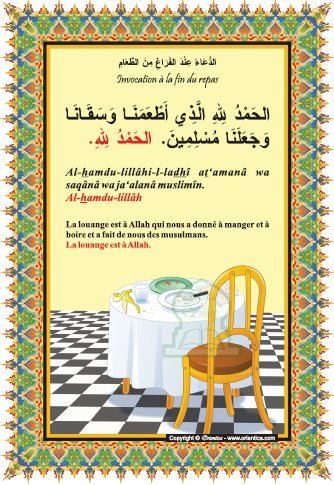 Invocation après le repas : "La louange est à Allah qui nous a donné à manger et à boire et a fait de nous des musulmans. La louange est à Allah."