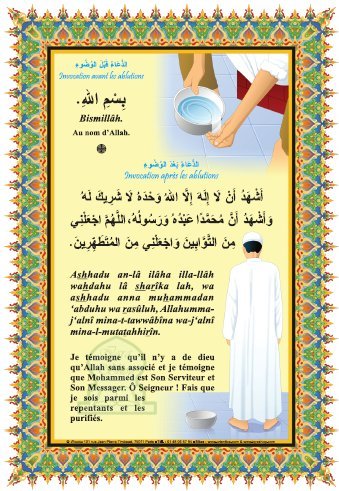 Invocation après les ablutions : "Je témoigne qu’il n’y a de dieu qu’Allah sans associé et je témoigne que Mohammed est Son Serviteur et Son Messager. Ô Seigneur ! Fais que je sois parmi les repentants et les purifiés."